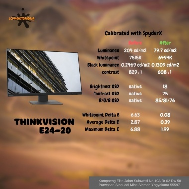 With its 23.8-inch display, 3-side NearEdgeless, and In-Plane Switching (IPS) panel, the ThinkVision E24-20 is positioned as an everyday workhorse. An array of ports like HDMI, DP, and VGA offers versatile connectivity. Ergonomic design, with a broad lift, tilt, and pivot range, enhances user comfort and productivity, making it a smart choice for offices. Harga yang tertera adalah harga acuan saat produck ini tayang pada web kami. Produck ini telah kami uji akurasi warna nya dengan mengunakan Colorimeter Datacolor Spyder X, dimana hasil pengukuran pada produck ini kami sertakan pada foto produck. Dyefa Computer melayani jasa kalibrasi monitor dengan biaya Rp 100.000 (seratus ribu rupiah) untuk produck yang dibeli di store kami Untuk reservasi kalibrasi CallWA 0817-041-2212