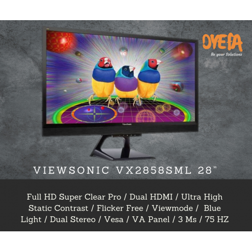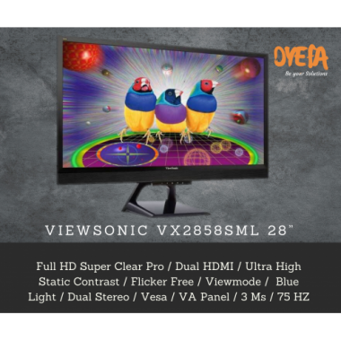 The ViewSonic VX2858Sml is a 28" (28" viewable) Full HD 1080p display designed for entertainment and multimedia applications. Equipped with SuperClear® Pro technology, true 8-bit colours, and a 3000:1 static contrast ratio, the VX2858Sml delivers superior colour performance with excellent colour reproduction at nearly any viewing angle. Dual MHL ports enable seamless connectivity and simultaneous battery charging of MHL-enabled mobile devices—facilitating easy content sharing and mobile gaming on a larger screen. The MHL ports can also be used as HDMI ports for basic connection to gaming consoles, set-top boxes, and other multimedia peripherals, while a VGA port provides legacy connectivity. ViewSonic’s proprietary Flicker-Free technology and Blue Light Filter helps to eliminate eye strain from extended viewing periods.TECH SPECS